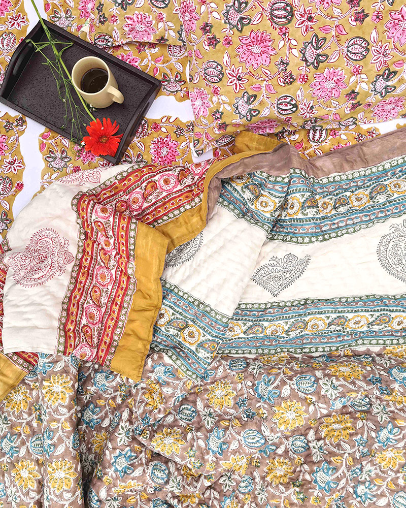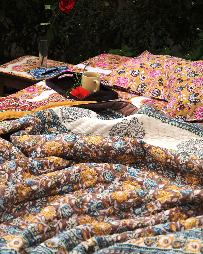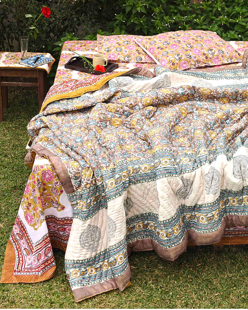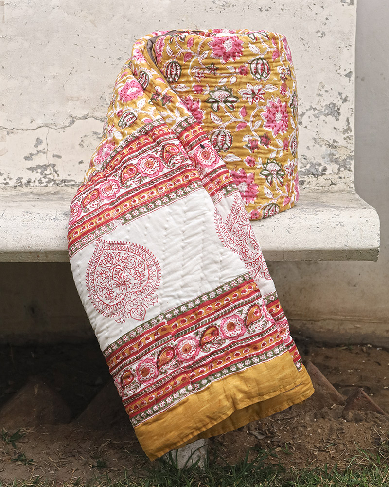 Crafted with thick layers of organic cotton sandwiched between two layers of fabric for enhanced warmth and quilted intact by skilled artisans, it ensures a luxurious sleeping experience. Flip it for a whole new look!