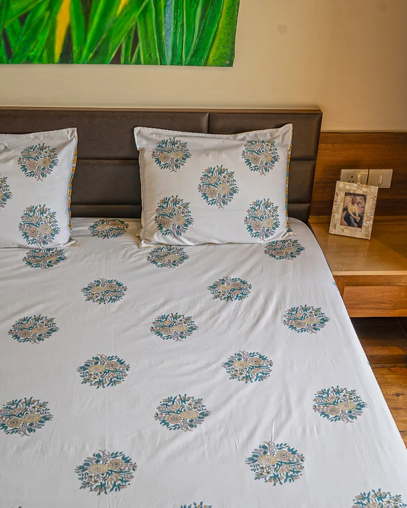Turquoise and White Floral Premium Organic Cotton Bed Sheet Set