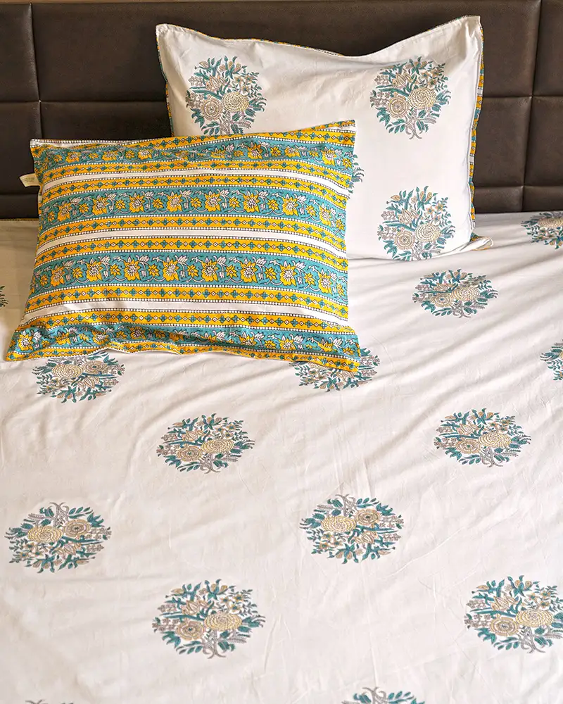 Revitalise your sleep experience with our king-size bed sheet set, meticulously crafted for a perfect fit at 275 x 275 centimetres. This captivating piece features a timeless ethnic floral boota in soothing turquoise and peach, infusing tranquillity into your bedroom. Handcrafted from 100% organic cotton and adorned with intricate hand-block printing, this bed sheet is a testament to luxury and comfort. Its ultra-soft texture guarantees a restful night’s sleep while effectively wicking away sweat, promoting skin and hair well-being. Tailored for the urban sustainable lifestyle, this bed sheet is toxin-free, machine washable, and exceptionally durable.