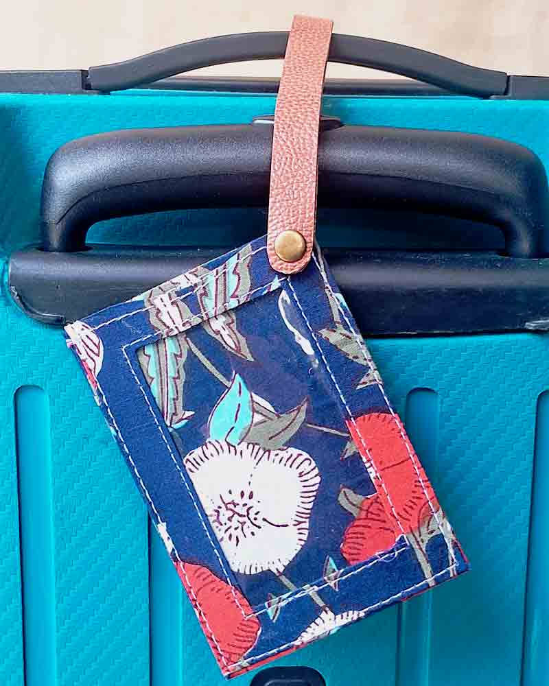 • Upcycled luggage tag made from factory fabric offcuts.